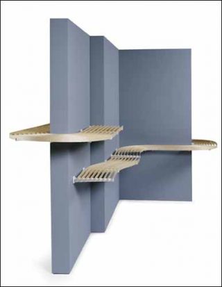 L’autre hypothèse valorisée par le VIA comme réponse à la recherche d’un design environnementalement juste est celle d’objets ne s’affirmant plus comme des entités uniques, mais s’inscrivant comme parties d’un tout plus vaste. Façon d’affirmer qu’il y aurait quelque chose d’ « écologiquement conscient » à préférer des objets qui ne puissent d’emblée se donner comme des objets de désir, appels à la consommation frénétique. Ils matérialiseraient aussi le sentiment qui prévaut dans la prise de conscience de l’urgence environnementale : la sensation que l’action de chaque élément isolé se répercute sur un réseau, un « écosystème ». La bibliothèque Infinity de Samuel Accoberry prend donc forme grâce à l’architecture sur laquelle elle est fixée.