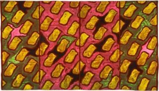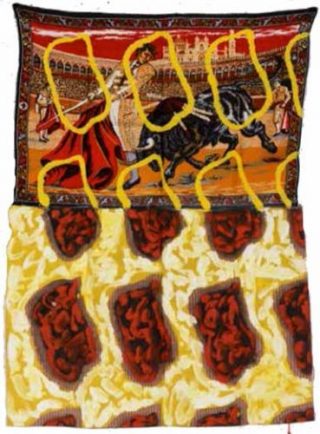 Dès 1966, l’artiste met au point son système pictural auquel il est demeuré fidèle et qui lui permit d’un coup d’évacuer le problème de la représentation: utilisation d’une forme aussi neutre que possible qui fait songer à une palette ou à un osselet. Cette forme entre en contact avec des supports variés, en se répétant à l’infini: draps de lits, toiles de tentes, rideaux, sacs de jute, parasols, voiles de bateau. Ce rebut de la civilisation est annexé dans le champ de l’art par l’artiste avec sérieux, joie et une bonne part d’ironie.