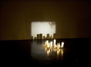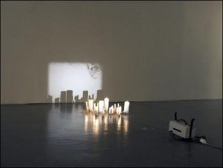 L’artiste s’approprie ici à son tour «ce que ces lignes produisent, induisent, impliquent» en explorant la polysémie métaphorique de la frontière. A travers un jeu d’ombres et de bougies, une ville prend feu. La frontière prend alors le sens d’opposition et de conflit. Le regard critique de l’artiste est la lunette d’une génération devenue insensible aux événements tragiques relatés perpétuellement par les médias. «Les spectateurs sont ici à la fois consommateurs de cette image de guerre et acteurs de sa commémoration.» Ce dialogue constant entre histoire personnelle — ses souvenirs des premières images télévisées de guerre — et Histoire, se lit en filigrane dans chacune de ses Å“uvres.