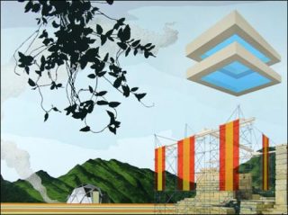 Dean Monogenis travaille à partir de sa propre collection d’images accumulées lors de voyages ou trouvées sur Internet. La réalité architecturale que Dean Monogenis prend soin de reproduire avec précision, est sans cesse perturbée par un choix de coloris fantaisistes et l’insertion d’éléments graphiques abstraits. Le savant mélange opéré entre les zones peintes à la main et les éléments appliqués au pochoir sur panneaux de bois ou de plastique, la présence de lignes ou de damiers, les jeux de couleurs non naturelles, la superposition des surfaces annulant toute notion de premier plan ou d’arrière plan, nous plongent dans un état de doute et de sourde confusion propre à la vraisemblance.