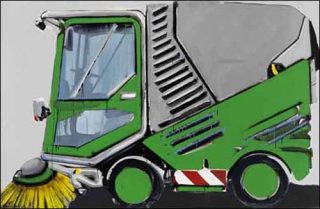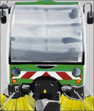 Le vert électrique des sacs poubelles, des poubelles à roulettes et des camionnettes balayeuses à jets d’eaux incarne un concept urbain de propreté selon une symbolique du recyclage et du bon geste envers la nature. Cette grammaire au travers de laquelle nous circulons, et que l’on n’interroge même plus, est le sujet de la nouvelle série de peintures de Tatjana Doll, comme un écho inversé à sa première et précédente exposition qui présentait des peintures de Ferraris rouges.
