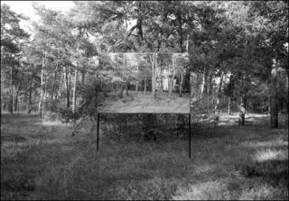 Willa Niespodzianka met en scène la photographie d’une maison moderniste prise à Otwock en Pologne et installée in situ pour y être re-photographiée, face au bâtiment. De façon imprévisible, la villa avait été détruite entre-temps et le projet ainsi modifié, prenait l’apparence d’un hommage à une architecture à l’avenir menacé. Si le motif de la disparition semble ici récurrent, alors que la grande affiche de la maison polonaise installée dans la forêt côtoie un socle vide photographié aux Buttes-Chaumont, il ne s’agit pas là de se laisser aller à un sentiment de vacuité, mais de rendre ces architectures, ces relations internes et symboliques, plus permanentes et objectives.