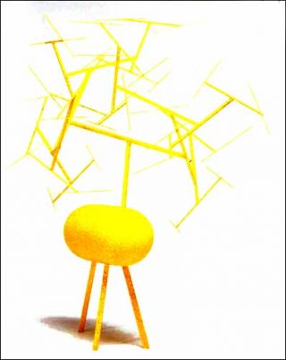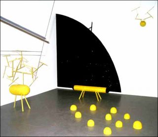 Il y a donc ici une variété délibérée, une séduction ouverte, sans bavardage. L’ensemble conjugue acidité (jaune citron) et volupté, dans une sensualité un peu hérissée (le noir, les baguettes, les paillettes). L’artiste crée des contrastes de couleurs, de matières et de formes au sein d’une sorte de territoire assez dérangeant, apparaissant comme un signal lumineux qui ne renverrait à aucun code véritablement identifiable.
