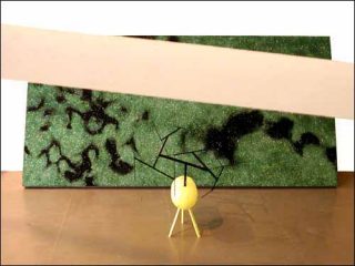 Entre un décor fantastique et une série d’éléments appartenant peut-être à une même famille, le regard est sollicité, mais le corps doit rester à distance. Le monde des objets, inerte mais parfois inquiétant, souvent dérisoire, pourrait montrer une fois encore que l’humain désire aussi se tapir dans l’absurde pour échapper à l’emprise des idées reçues.