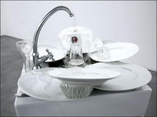 — Vincent Ganivet, Fontaine I, II, III, 2011. Vaisselle, évier, pompe à eau