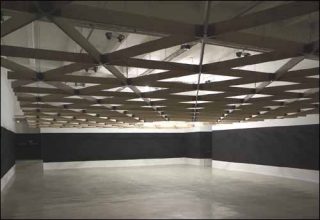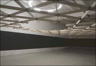 Vincent Lamouroux occupe entièrement l’espace inférieur du Crédac, par une étonnante installation qu’il titre Grounded: un faux plafond évidé, de structure modulaire et triangulaire, en bois et métal, suspendu par des câbles, et ouverte — inachevée pourrait-on dire — dans une zone circulaire surmontée d’un cercle de néons blancs et faussement défaillants (qui s’allument et s’éteignent, tour à tour et de façon aléatoire), enfin, un monochrome noir, une bande de 1,80 mètre de large, (une hauteur d’homme) déroulée sur les quatre murs autour de la salle.