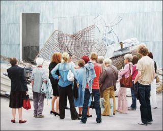 L’exposition apparaît comme un condensé des réponses qu’il donne à une question qui l’obsède depuis des années: Qu’est-ce qui se passe quand il ne se passe rien? Pour y répondre, il est prêt à travailler mois après mois, 12 heures par jour, pour peindre une rue apparemment banale, une tablée de fin de fête, un couple absorbé dans ses pensées respectives, ou des touristes face à une installation. Son implication se fait sentir: ses meilleurs tableaux nous permettent de retrouver le goût d’un monde si familier que nous ne savions plus le voir, un étonnement. Si les sujets diffèrent avec le support, tout est empreint d’un réalisme très personnel qu’il oppose de front à l’hyperréalisme d’une certaine peinture contemporaine. S’il travaille d’après des montages photographiques, Thomas Lévy-Lasne abhorre pourtant les effets que la peinture emprunte à ce médium: pas de flous optiques chez lui.