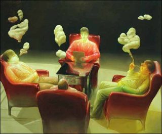 Katharina Ziemke figure quatre gros hommes affalés dans des fauteuils autour d’une table de salon. En les peignant comme s’ils étaient en matière plastique, l’artiste les rend lisses.