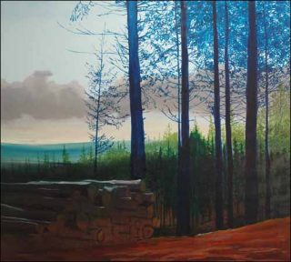 Olivier Masmonteil revisite le paysage en évoquant clairement Caspar David Friedrich, Hodler ou des paysagistes américains. Dans Augenweide, aux arbres bleus, le geste est spontané, l’aspect des troncs est brut, et les traces du pinceau leur confèrent un dynamisme extraordinaire et une matière surprenante.