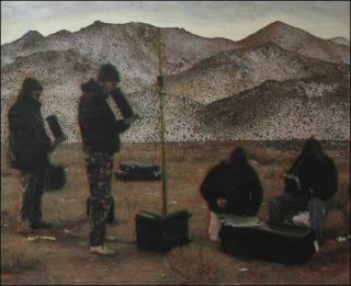 La situation dans Invasion est difficilement identifiable. Des hommes, certainement des militaires, effectuent, à l’aide de drôles de machines, un relevé topographique de l’Irak avant son invasion, explique l’artiste. Les hommes sont curieusement cernés par un trait vert fluorescent. On pressent l’arrière plan obscur de la guerre, on éprouve une violence donnée dans sa dimension fantastique.