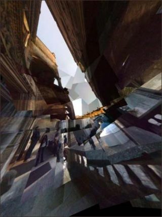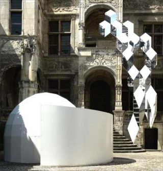 On pénètre dans cette sorte de chambre d’écoute par un boyau circulaire qui se rétrécie lentement. Cette architecture d’inspiration méditerranéenne tranche avec le style Renaissance de l’Hôtel Gouïn. Fixée sur la façade de ce dernier, l’évocation visuelle d’une courbe de fréquence interpelle le visiteur. Des volumes anamorphosés rassemblent des images d’archives de la reconstruction de l’Hôtel au sortir de la seconde Guerre mondiale, des miroirs qui reflètent le ciel et des aplats blancs qui expriment la pureté de l’algorithme. Il ressort de cette triangulation le sens d’une architecture fondamentale que l’on retrouve dans la composition sonore.