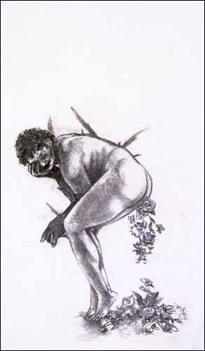 — Léda l’ange, 2003. Sérigraphie sur transfert sur mur rehaussé de crayons et de fards (en collaboration avec Nils Trannois et Sophie Bueno).