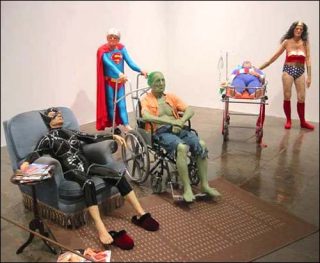 Parmi ces œuvres, certaines sont particulièrement mémorables, par leur dose de dérision et d’humour: Ridicularis, sculpture de Hyungkoo Lee, de 2008, qui figure, de façon hyperréléaliste un squelette «grandeur nature», d’environ un mètre de hauteur: celui de Dingo,  parfaitement proportionné, avec le museau, les dents et les mains qui conviennent ; la sculpture suspendue en hauteur de Virginie Barré, Fat Bat, de 2005, représentant Batman obèse, débordant de sa célèbre combinaison; et, bien sûr, l’excellente et monumentale installation de sculptures de Gilles Barbier: L’Hospice, de 2002, où les super héros comme Superman ou Hulk sont en maison de retraite, vieillis et grabataires, sous perfusion, se déplaçant à l’aide d’un déambulateur.