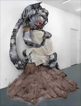 — One (mother earth, staircase), 2007. Installation avec matériaux divers, dont briques, bois, béton, peinture en spray, vêtement empaillé dimensions variables. Mother earth : matériaux incluant toile et vêtement empaillés sur socle (béton et filet métallique) environ 400 x 260 x 150 cm