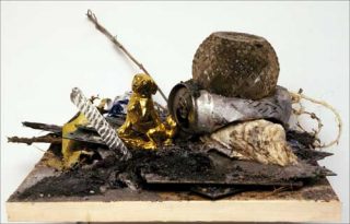 — TBD, 2007. Papier, sable, terre, plastique, verre, aluminium, coquillage, circuit électronique, bois et or sur bois de bouleau. 18 x 31 x 31 cm