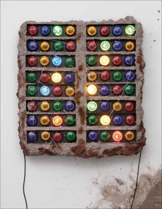 — Nineteen (Light and Soundtrack), 2007. Installation avec matériaux divers, dont ampoules colorées, câble, béton, bande-son sur CD (lecteur CD, amplificateur et haut-parleurs). 90 x 105 x 22 cm