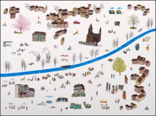 Dans le cadre de son exposition, Kim Bom présentera sa vision de Strasbourg, et plus précisément de son centre-ville. Les informations picturales semblent être extraites d’une carte de géographie, voire d’une photographie prise d’un avion survolant la ville.