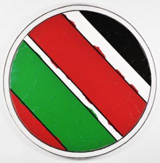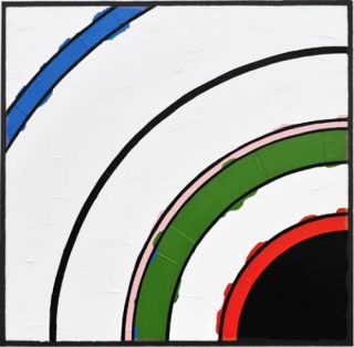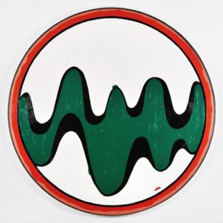 Parmi les six nouvelles œuvres présentées, certaines conservent sur les contours ou bordures extérieures des marques d’impression jet d’encre, qui leur confèrent alors une portée vintage ou kitsch. La surface a toutefois été recouverte de peinture, dont on perçoit sur chaque toile l’épaisse trace laissée par le pinceau de Bertrand Lavier. Par là , le geste de l’artiste nous parait ample, gourmand, généreux dans ces œuvres grand format. Les toiles prennent des tonalités carrément pop, en traçant une courbe fréquentielle d’un vert profond, elles rejouent le motif abstrait de la ligne sinusoïdale déjà présent dans Walt Disney Productions, 1947-1984 n°7, mais le déclinent désormais à l’horizontale. Encore, elles utilisent le registre de la courbe, du disque et du cercle, faisant glisser notre regard vers le hors-champ de la toile.