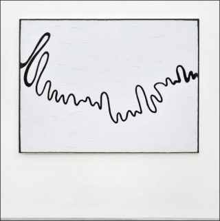 La seconde œuvre, quant à elle, est accrochée sur un mur jaune criard, dont le ton rappelle les couleurs originales utilisées dans les albums de Mickey. Il s’agit d’une pièce réalisée à l’impression jet d’encre sur toile, dont les motifs font référence au vocabulaire de l’abstraction picturale: des bandes verticales, une ligne sinusoïdale au milieu, et des taches noires ponctuant la toile. Aussi, nous remarquons que le fond blanc ainsi que le contour brun de la pièce révèlent de petits points, comme s’il s’agissait pour Bertrand Lavier, à l’instar de Roy Lichtenstein, de reproduire le style même de la bande dessinée, de sa production industrielle, et des techniques des ateliers d’imprimerie.