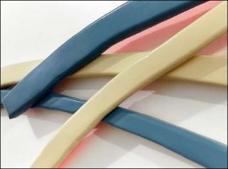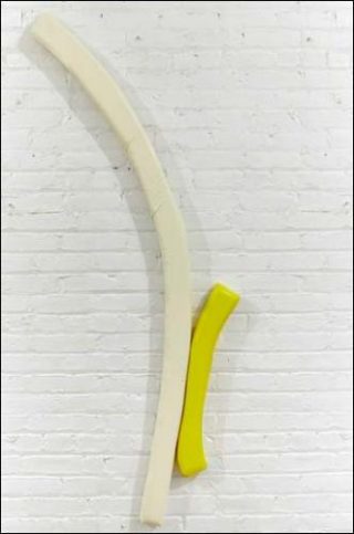 Ces formes faussement molles, constituées au départ de coussins compressés dans des châssis, sont ensuite recouvertes d’une toile étirée. Elles évoquent, dans la tradition de la sculpture américaine, bien évidemment celle de Robert Morris, Richard Tuttle, Lynda Benglis, mais aussi Franz West ou Eva Hesse. Dansantes et actives, elles convoquent encore les toiles d’Ellsworth Kelly. Mais à les regarder attentivement, on y décèle une tension et un sens de la composition, que Justin Adian accentue dans la mise en espace de ses accrochages.