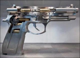 Dans la salle centrale du Musée est présentée l’œuvre monumentale W Fire at Both Ends Automatic handgun D13-01, représentant un revolver; les balles y sont chargées de face et à l’envers de façon à ce que si «on appuie sur la gâchette, on ouvre le feu sur soi-même.» C’est par ces images hautement symboliques que l’artiste veut parler de la guerre, «car la logique de la guerre c’est une corrélation entre tuer et être tué.»