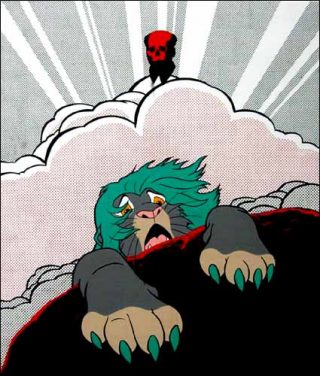 Dans un autre tableau, le père du Roi Lion, un rugissant monarque, s’agrippe à un pic rocheux avant de tomber dans le vide. Émanant des vapeurs grisées, une tête de mort –Mao !-, annonce son sort funeste.
