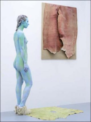 Les installations à grande échelle de l’artiste combinent des matériaux tactiles, vêtements, chaussures, tissus, ou objets de récupération, qu’elle déconstruit, et fige dans la peinture. Recombinés avec des matériaux plastiques, latex, ou superposés en couches sur des châssis, les objets usagés ou portés donnent naissance à de nouveaux artefacts. Reliés dans l’espace par un réseau de correspondances, sémantiques et plastiques, les éléments statiques sont activés lors des performances au cours desquelles des modèles vivants, camouflés, cristallisés dans l’installation entrent en interaction avec les Å“uvres.