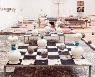 «We Don’t Work Sundays» est le troisième volet d’une trilogie d’expositions récentes à la South London Gallery (Londres) et à la Mistake Room (Los Angeles). Consacrée à l’esthétique de la répartition du travail, l’exposition témoigne de l’étendue de sa pratique, avec la présentation de peintures, sculptures, dessins et d’une projection vidéo.