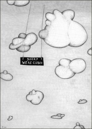 C’est ainsi qu’à l’entrée d’une église (The Site Specific Mobiles, Boarding, 2012), le fidèle est interloqué par un panneau lumineux indiquant l’heure d’embarquement pour le paradis, ou encore, qu’au hasard d’une balade, le promeneur fait face à une fontaine déversant une eau d’un noir opaque (The Site Specific Mobiles, Liquid Black Night Fountain, 2012): jaillissement de pétrole, « shit fountain» ou liquéfaction du noir de la nuit, selon les interprétations (Le dessin The Shit Fountain (2006), extrait de la série The Drawn Exhibition est présenté dans cette exposition en regard de l’œuvre Site Specific Mobile, Liquid Black Night Fountain (2012).