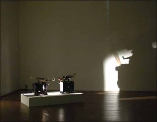 L’œuvre de Rosa Barba, elle, impose à nous sa forme énigmatique et sa rhétorique de l’absurde. Posés sur un socle à la manière de sculptures, deux projecteurs se font face, comme s’ils s’accusaient l’un l’autre, engagés dans une discussion interminable. Chacun d’eux projettent en continu un film vierge d’une durée de quatre minutes accompagné d’une bande son, qui fait entendre sa mélodie métallique : bruits de vieilles machines et extraits audio de films de Fellini — symboles d’une industrie obsolète ? Leur semblant de conversation se révèle n’être rien d’autre qu’une compilation grinçante, qui se répète à l’infini et se chevauche, apparemment privée de sens. Fermée sur elle-même, l’oeuvre s’ouvre pourtant vers l’extérieur. La lumière produite par les projecteurs porte leur ombre menaçante sur le mur de la galerie, dramatisant l’espace en une autre sculpture, cette fois immatérielle.