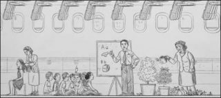 C’est également dans cet esprit que l’on peut voir son dessin géant réalisé avec l’aide du dessinateur Dylan Horrocks. En forme de rouleau de plusieurs mètres de long, la scène représente la carlingue vue de profil d’un avion. Les sièges sont à l’envers. Le haut et le bas sont inversés. Mais cela ne semble pas déranger les passagers qui vaquent aux occupations les plus diverses mais surtout les plus saugrenues.