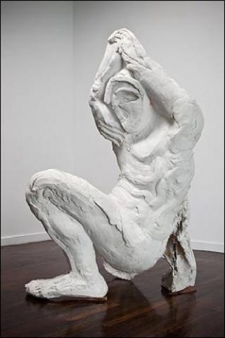 Ses personnages, tantôt marchants, tantôt rampants, sont représentés dans des poses qui évoquent une hypothétique transition entre l’homme et l’animal. Physiquement imposants, monstrueux et puissants, ils apparaissent pourtant fragmentés et vulnérables.