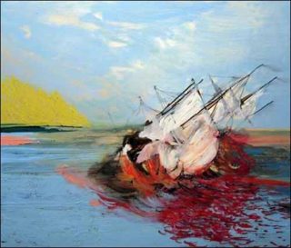 Dans Untitled (Rainbow) (2004), la scène est dramatique: un trois-mâts majestueux s’incline dangereusement; la couleur rouge sang se répand sur la mer et tache même les voiles du navire, évoquant un terrible carnage; à l’horizon, un jaune de feu rappelle le combat proche. Peinture de bataille, l’œuvre rejoint la grande tradition de la peinture d’histoire. Ailleurs (Turning Over, 2003), les taches d’encre nous remettent en mémoire les visions maritimes hallucinées de Victor Hugo dessinateur.