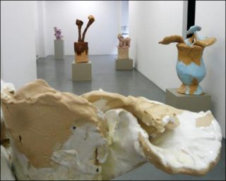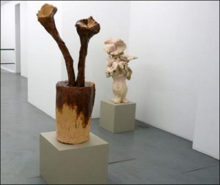Drolatiques, espiègles, jubilatoires, ces compositions florales, défient toute proportions académiques, tant par leur gigantisme, que par les nombreuses zones de terre brute, laissées à «vif» dans la cuisson, et qui transparaissent au milieu d’un émail qui coule, telle une sève parée de couleurs sucrées.