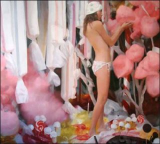 Jouant avec les références à la peinture française du XVIIIe siècle, de Fragonard à Boucher, Will Cotton conçoit ses toiles comme des utopies. Ce sont des paysages d’abondance où règnent des créatures parées de diadèmes de biscuit, entre ange, déesse ou pin-up. Leurs corps dévoilés, séduisants mais inaccessibles, sont «posés» dans des univers ambigus où la terre et le ciel se dissolvent.