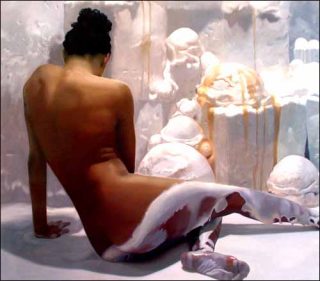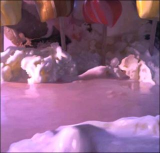 Le grand tableau Sugar Beach montre trois jeunes filles en sous-vêtements, mollement assises sur une dune de sucre glace, l’air abruti et repu, comme gavées de meringues dont elles tiennent encore un morceau à la main. Leur peau jeune et rose, leur chevelure abondante tombant sur les épaules en font des objets de désir. Ice Cream Cavern évoque plus directement encore cette idée : un personnage féminin de dos, la nuque soigneusement dégagée, baisse la tête devant un amoncellement de boules de glace, à la forme phallique sans équivoque, se dressant autour d’elle. Le détail de la cuisse nimbée de crème fondue au premier plan fonctionne comme une cible excitant la pulsion scopique.