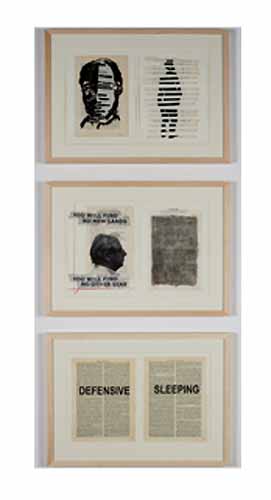 Ces pages déchirées, coupées, collées, biffées, sont aussi le support de dessins à l’encre qui flottent comme des réminiscences de l’histoire de l’art ou de la littérature (Berthe Morisot, et la Suzon des Folies Bergère de Manet, les nus de Degas, ou les héros de Cervantès…). La magie réside dans la fusion de ces matériaux hybrides, le froissé d’un lit avec les déchirures d’une page, ou les fissures qu’elles ouvrent sur un corps africain.