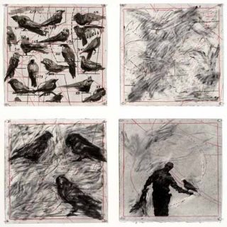 — Bird Catcher, 2006. Fusain, pastel et encre sur papier. Ensemble de 4 dessins. 40 x 40 cm chacun.