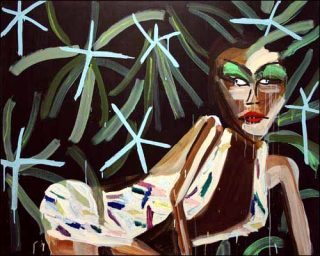 Parallèlement, Katherine Bernhardt manifeste une volonté de s’affranchir du passé et de désigner de nouvelles icônes – comme les mannequins Omahyra Mota ou Jaunel Mackenzie – qui auront la responsabilité de refléter les années 2000. L’artiste s’alimente littéralement des émotions au sein de l’univers mi-hip-hop, mi-sex, drugs and rock’n’roll. Des figures universellement réputées pour leurs frasques ou leur look comme Paris Hilton, Kate Moss ou John Galiano sont revisitées par les peintures; la fête bat son plein comme en attestent Jaunel Mackenzie and Friends ou Dance party. Where is di Dance? Quant au style vestimentaire des protagonistes, il est tout simplement le fruit d’une remarquable imagination. Katherine Bernhardt attache une grande importance aux matières, motifs, couleurs et imprimés, s’évertue à les détailler à la manière d’un véritable couturier, pare ses personnages comme pour un tour sur le podium.