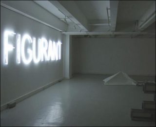 Une sculpture de parpaings recouverts d’une peinture utilisée dans la signalisation routière, est réfléchie par un mot en néon: Figurant, qui représente l’idée principale de l’Å“uvre.
