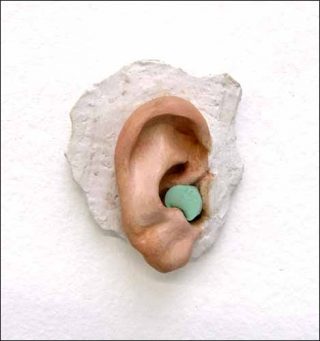 — Kate Lowenstein, Hearo, 2003. plâtre, peinture acrylique, bouchon d’oreille.7 x 8 x 3 cm.