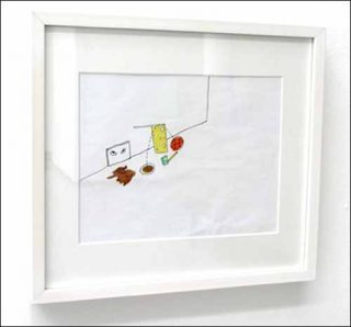 D’une autre nature sont les douze dessins de Matthew Ronay, des travaux préparatoires à ses œuvres plastiques, des sortes de jouets d’enfants. Mais il ne faut pas s’y méprendre, ses montages d’objets incongrus et naïfs cachent en fait des obsessions érotiques refoulées (withdrawn) et expriment des jeux qui n’ont rien d’enfantin. Ceux-ci révèlent l’écart entre les dehors innocents d’assemblages surréalistes et des pensées scatologiques et pornographiques dont la réalité est soit crûment rendue par des titres qui ne laissent place au doute comme Your Baseball Fell Into My Picnic While I Was Getting Fucked in the Ass (2004), soit suggérée par des titres à double entente comme Chocolate and Sauce (2003).
