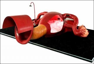 Formellement, Womb House est un utérus géant aux couleurs sans équivoques rappelant les planches anatomiques de médecine. En réalité, cet objet est une sorte de nécessaire de camping très complet bien qu’un peu trash. L’entrée de cette maison-utérus se fait par un conduit qui donne accès à un lit et les deux trompes latérales contiennent un minibar, une douche, des toilettes, etc. : bref, tout le nécessaire à la survie en milieu hostile.