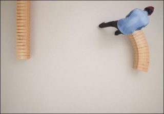 En plaçant les différents éléments côte à côte, et en les cerclant d’un bague de métal, Chris Kabel reproduit exactement le veinage du bois, et renforce la majesté de la matière et la qualité organique de l’Å“uvre.