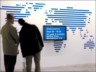 Dans World News, une grande carte murale du monde est schématisée à l’aide de bandes d’adhésif bleu. Sur un écran plat placé au niveau de l’Afrique des phrases défilent en blanc sur fond bleu. Des informations composées de phrases brèves sont émises sans discontinuer :