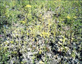 Toxique et inexploitable ce terreau chimique parvient malgré tout à laisser pointer ici et là un peu de végétation. Des fleurs y éclosent et laissent apparaître mille couleurs. Contraste brutal entre une terre acide et des pétales colorés, la photographie ne donne à voir que des gros plans réalisés en aplats.