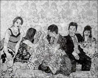 La Bank présente le travail de jeunes artistes, Nargess Hashemi et Lauren Kelley. Au rez-de-chaussée, Nargess Hashemi déploie des scènes de famille lumineuses et irisées. Des tissus rebrodés de paillettes sont recouvertes de bâches en plastique transparent. Des silhouettes sont tracées au feutre indélébile noir.