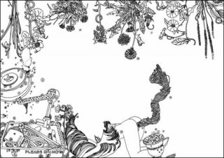 Des personnages féminins sont disséminés dans une faune florale foisonnante, abandonnés à leur sexualité solitaire et à des jeux saphiques. L’intimité de ces scènes érotiques est préservée par l’exubérance du dessin: l’œil se perd à vouloir distinguer les éléments les uns des autres. Un motif décoratif inspiré de l’esthétique rocaille court sans discontinu le long des murs, engendrant les êtres les plus fantastiques. Les lustres se transforment en couronnes suspendues, d’où émergent des jambes de femmes, et des formes animales monstrueuses.