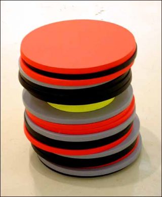 Une longue jetée en contre-plaqué est lancée jusqu’au centre de l’une des petites salles, au sol incliné. Une remise à niveau, qui permet à Stephen Maas de s’approprier l’espace, pour une réactivation de quelques sculptures, qui invitent à se défier des apparences. D’évidence pourtant, il est ici question de poids, de masse et d’équilibre, mais les matériaux faussent à l’envi les données du problème : la fonte se fait dentelle, les disques d’haltères empilés sont en bois peint, le squelette d’un polygone désarticulé, en terre cuite perlée d’émail, affecte la souplesse du textile. Le tout, sous l’égide d’une non-fonctionnalité revendiquée, à l’instar des câbles de télécommunication multicolores (Moonshine (r)), enroulés, et comme bouclés sur eux-mêmes.