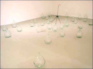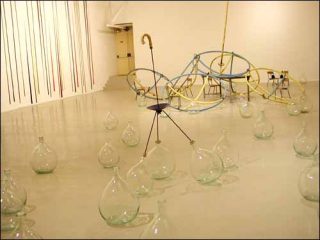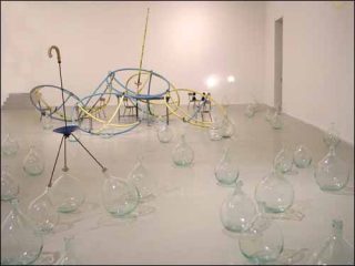 Par ailleurs occupé par une vaste installation poétique de Nicolas Hérubel. Le sol est parsemé de bonbonnes de verre, vides, prêtes à recueillir, chichement, par leur étroit goulot, une pluie improbable. La structure désarticulée d’une sphère métallique, à la peinture écaillée, qui repose inexplicablement sur une table de bivouac militaire, et de petites chaises d’écolier, devient un ensemble de paraboles — au double sens de l’antenne radar et de la fable —, comme des sondes tournées vers le ciel, qui guetteraient cette pluie, avec laquelle chacun doit faire. Alors que le reste, tout le reste, serait l’affaire de tous : une belle utopie en forme de devise, pochée à même le mur.